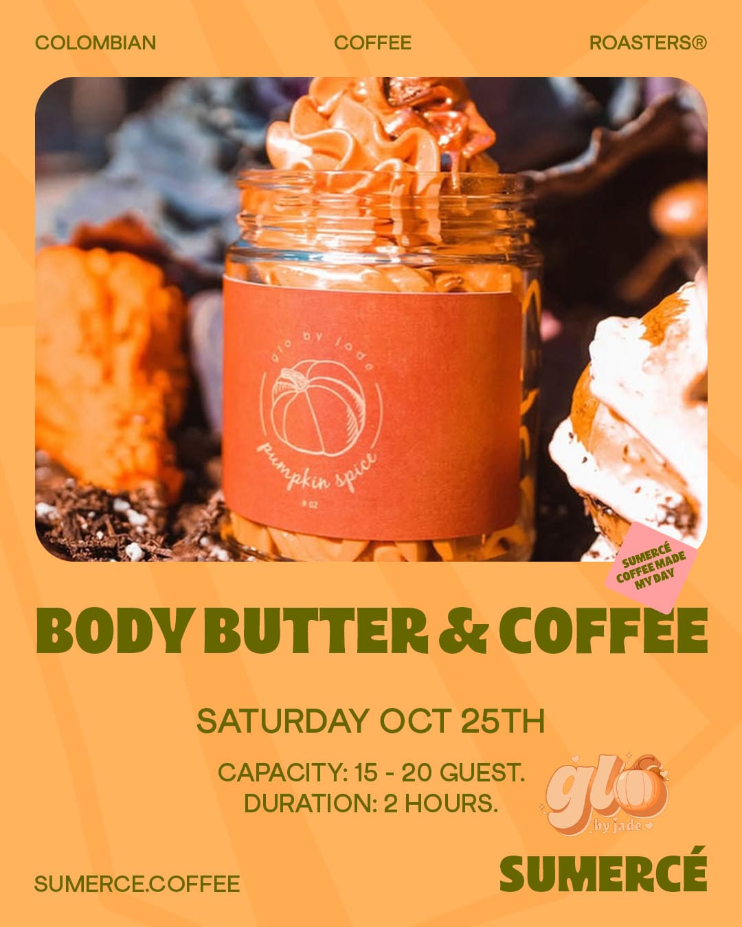This Saturday, October 25, join us and Glo for an exclusive workshop where you’ll create your own body butters while enjoying a Pumpkin Spice Latte Sumercé paired with a warm pandebono — Colombian style.